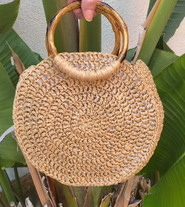 Bolso redondo de rafia natural tejido a mano, con asa rígida de terminación bambú que aporta un aire orgánico y veraniego. Su interior forrado, y su tamaño generoso permite llevar tus básicos —billetera, móvil y cosméticos— con comodidad.