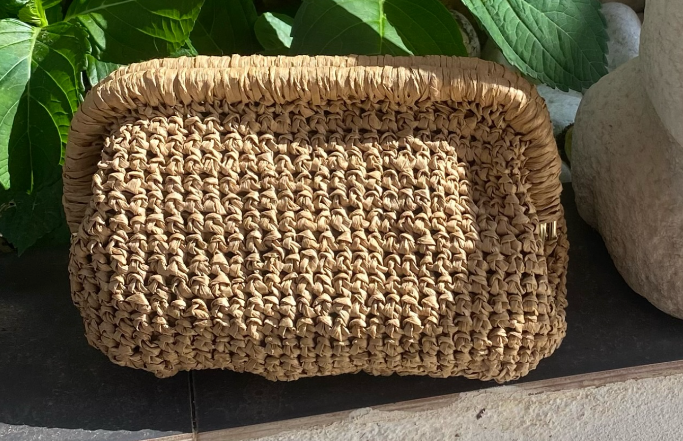 Bolso tipo clutch de rafia color natural, tejido 100 % a mano con textura y calidez artesanal. Su estructura rectangular se refuerza con un cierre metálico superior que facilita la apertura y el cierre.